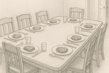 This piece captures the quiet resonance of togetherness lost to time—the space where love once gathered and conversation lingered. Each chair, each plate, each shadow tells the story of presence through absence, inviting reflection on what remains when the voices fade.