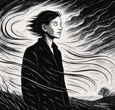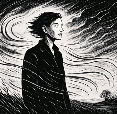 Amid a world of chaos, she stands still—eyes lifted toward what could be. The winds of uncertainty swirl around her, yet her spirit holds to hope, imagining a world shaped by compassion, calm, and understanding.