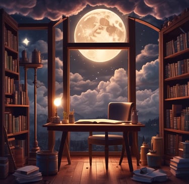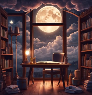 Beneath the watch of a generous moon, imagination becomes sanctuary. Here, stories whisper through open windows, and dreams take shape in ink and light — proof that every idea begins as a quiet act of believing.